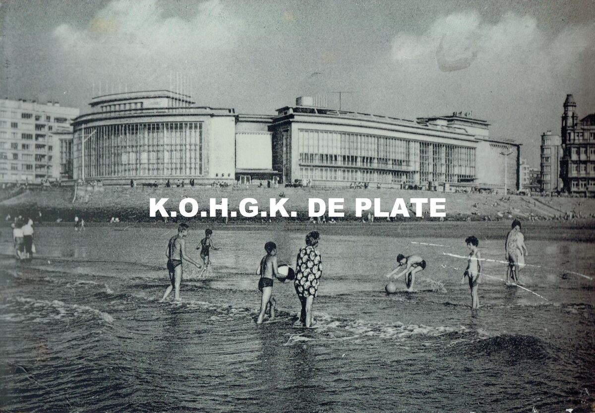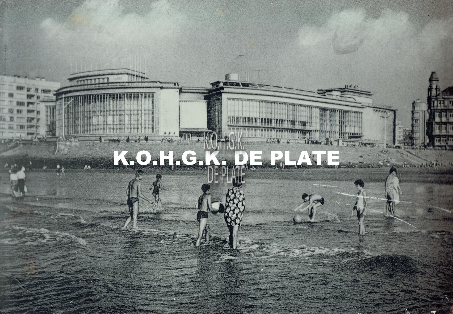 Formaat : 28 x 40 cm. - Zicht op het vierde kursaal en de zeedijk vanaf het Groot Strand. In de voorgrond enkele toeristen die pootje baden