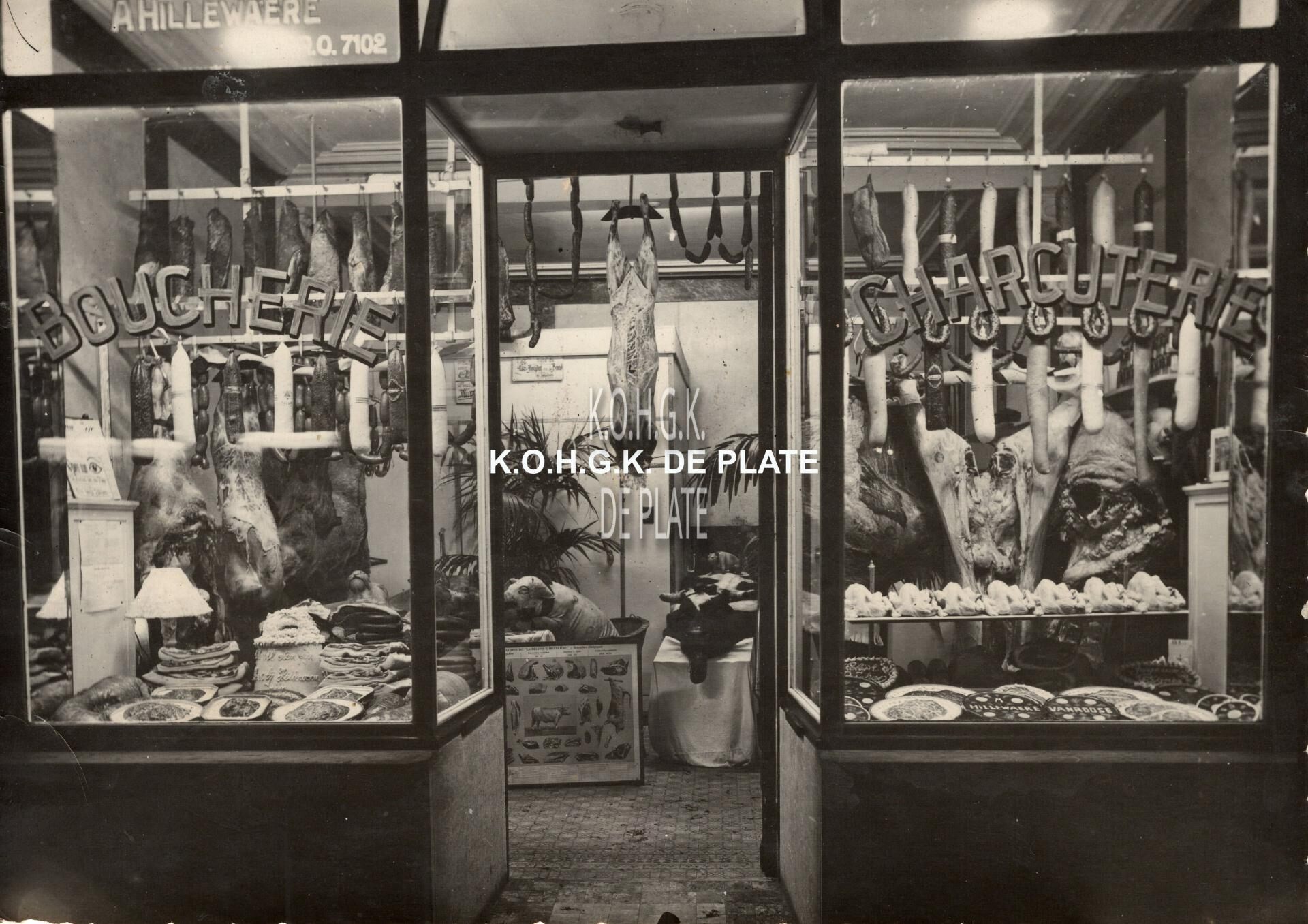 Formaat : 12,5 x 17,5 cm. - Op Witte Donderdag werden de etalages van de slagerijen speciaal versierd, zo ook bij slagerij Hillewaere.