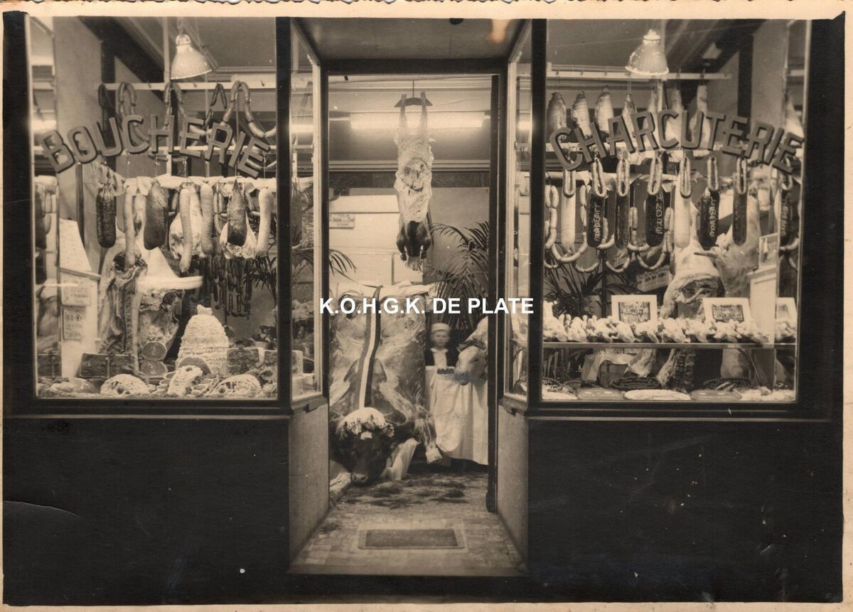 Formaat : 11,5 x 17 cm. - Op Witte Donderdag werden de etalages van de slagerijen speciaal versierd, zo ook bij slagerij Hillewaere. Het jongetje in de midden is Erik Hillewaere