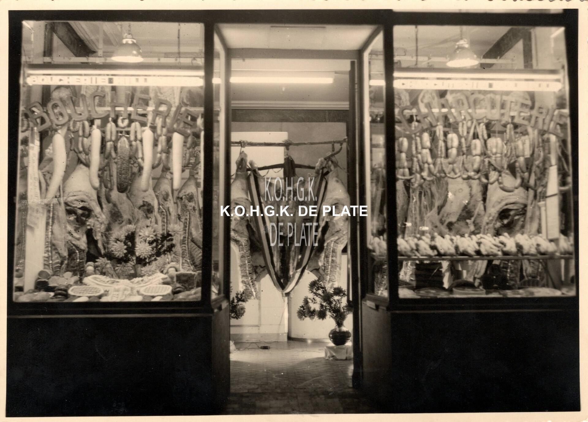 Formaat : 12 x 16,5 cm. - Op Witte Donderdag werden de etalages van de slagerijen speciaal versierd, zo ook bij slagerij Hillewaere.