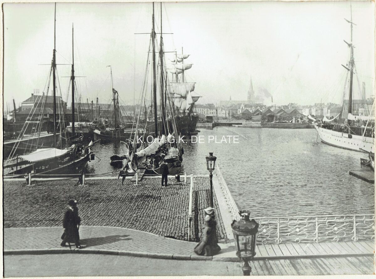 Formaat : 17 x 23 cm. - In de achtergrond de scheepswerven en de toren van de Sint Jozefskerk. Vooraan de Kapellebrug