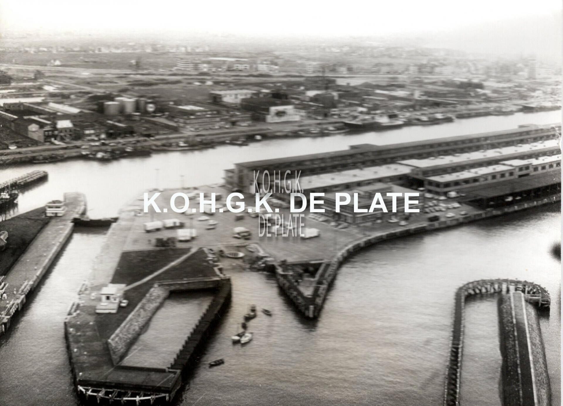 Formaat : 13 x 18 cm. - Helemaal links vooraan de Visserijsluis naar het Visserijdok. Rechts het Tijdok en vismijn met kantinegebouw. In de achtergrond de Vuurtorenwijk