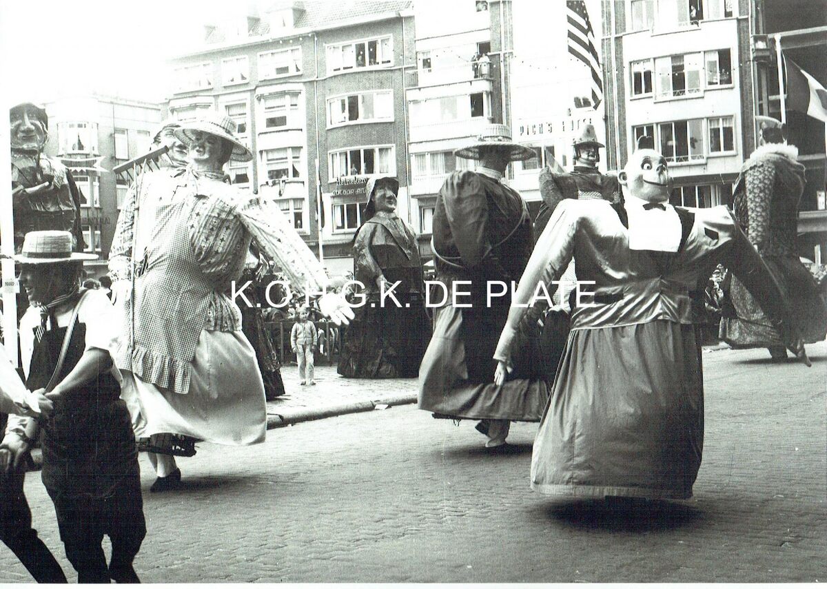 Vergroting. - Formaat : 30 x 42 cm. - Dansende reuzen tijdens een carnavalstoet op het Wapenplein. De Oostendse reuzen kijken toe.
