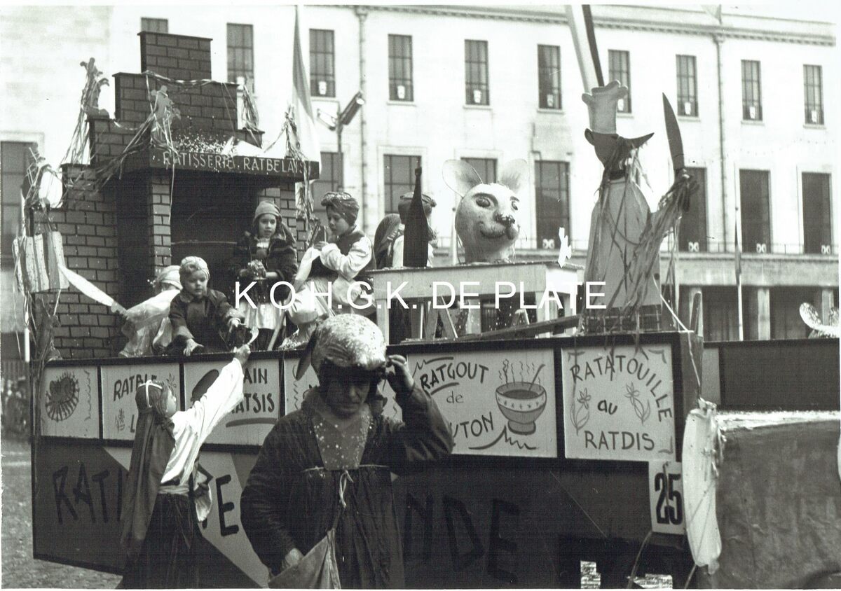 Vergroting. - Formaat : 30x 42 cm. - Kinderen op een praalwagen "Ratten delicatessen" in de carnavalstoet op het Wapenplein voor het feestpaleis.
