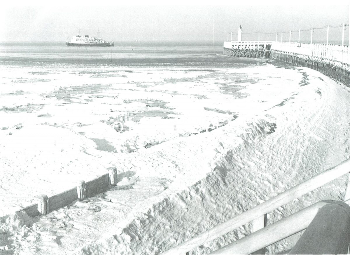 Vergroting. - Formaat : 30 x 42 cm. - Het Klein Strand onder sneeuw en ijs bij laag tij. Rechts, het Weststaketsel en de "Bas" ofte de strekdam naast het staketsel. Een pakketboot heeft de haven verlaten