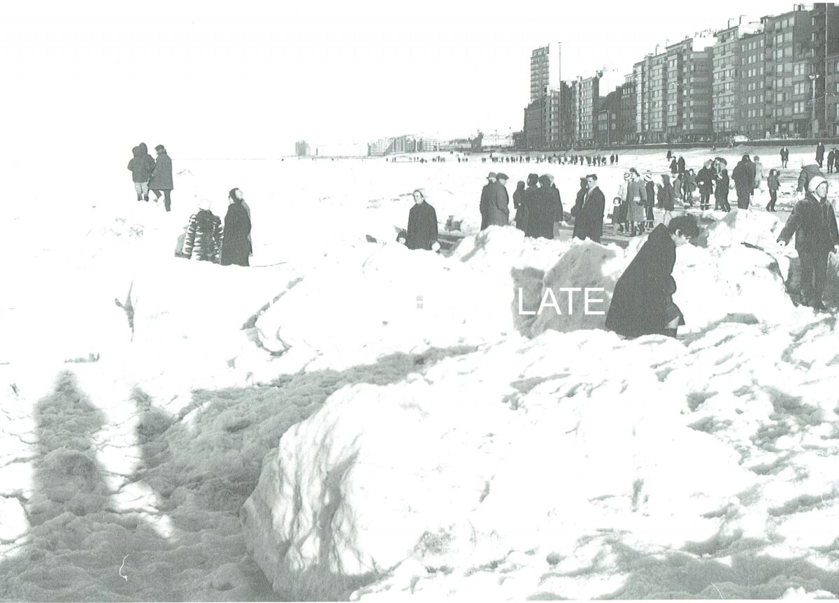 Vergroting. - Formaat : 30 x 42 cm. - Het strand aan de Zeedijk onder een massa sneeuw en ijs. Veel kijkers komen genieten van het zeldzaam schouwspel.