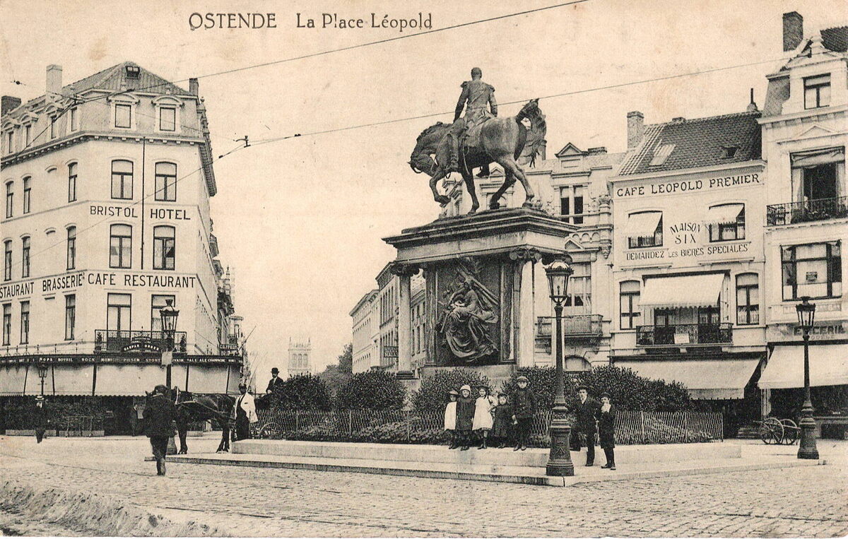 Formaat : 9 x 14 cm. - Ostende La Place Lépold. Rechtdoor de Karel Janssenslaan, Links Hotel Bristol en rechts Café Leopold premier