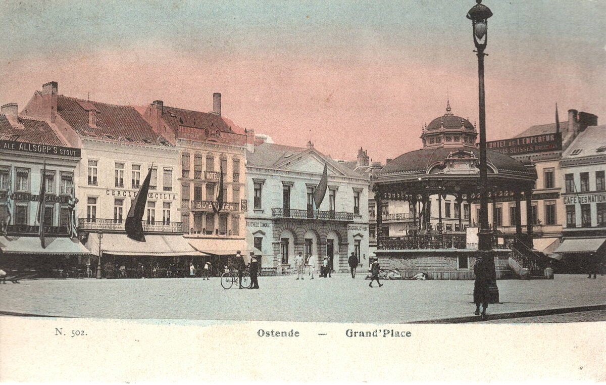Formaat : 9 x 14 cm. - N. 502. Ostende - Grand'Place. Rechts van de kiosk, hotel de l'Empereur (hoek Brabantstraat), daarnaast Café des Nations. Links van de kiosk, de Stadsbibliotheek(hoek Louisastraat), links daarvan Hotel restaurant Du Damier, en dan het gebouw van de Cercle Coecilia en The Falstaff