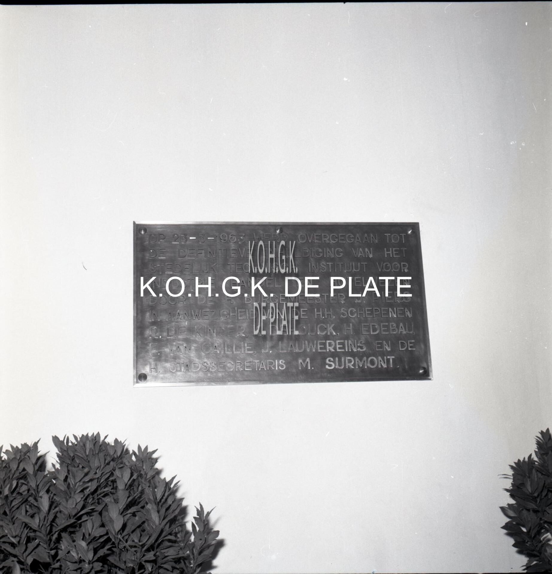 Negatief : 6 x 6 cm. - Plaket van de inhuldiging van het Stedelijk Instituut voor Industrie Handel en Hotelwezen.