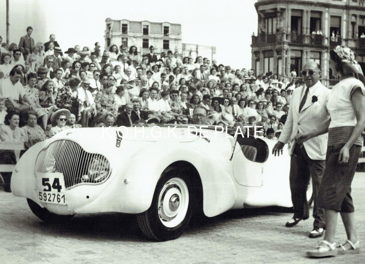 Vergroting. - Formaat : 28 x 40 cm. - Elegantiewedstrijd voor auto's op de Albert I-Promenade. Deelnemer nr. 54 passeert de jury aan de site van het nog niet herbouwde Kursaal.