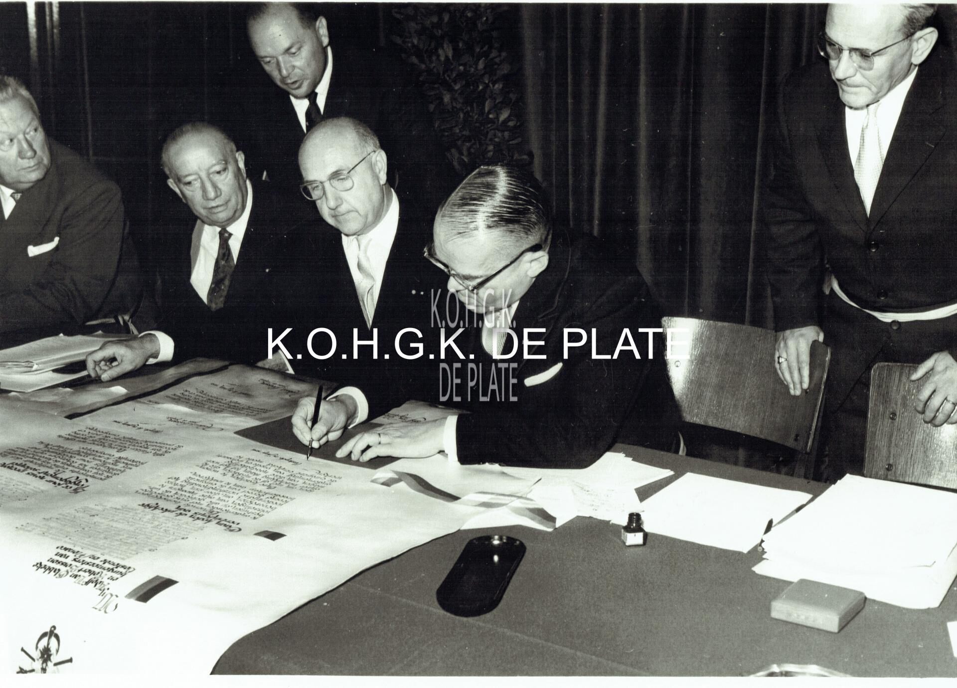 Vergroting. Formaat : 28 x 40 cm. - Burgemeester Adolf Van Glabbeke ondertekent de jumelage-eed, naast hem de heer Boisson, burgemeester van Monaco