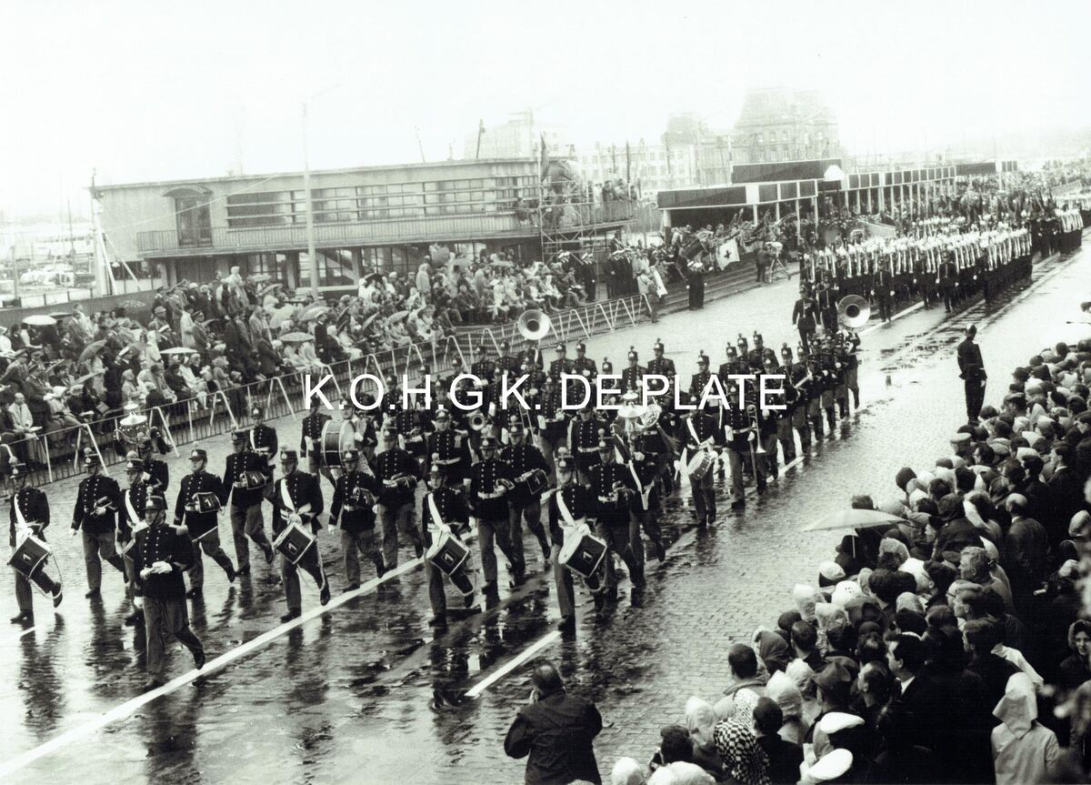 Vergroting. - Formaat : 28 x 40 cm. - De harmonie van de Gidsen (?) komt voorbij de eretribune en de garnaalmijn tijdens het defilé van 21-07-1966 op de Visserskaai.