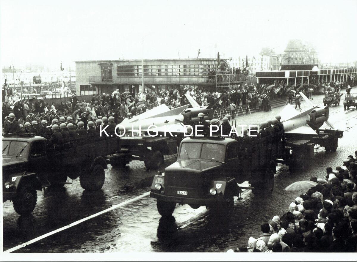 Vergroting. - Formaat 28 x 40 cm. - Een afdeling van de luchtdoelartillerie met raketten op de Visserskaai tijdens het défile van 21-07-1966. Links, de Garnaalmijn