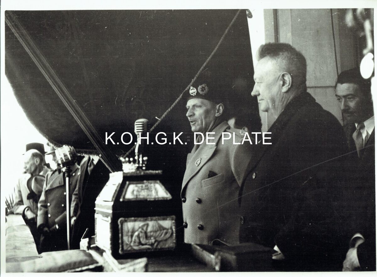 Vergroting. - Formaat 28 x 40 cm. - Veldmaarschalk Montgomery spreekt de menigte toe vanop het balkon van het stadhuis (huidige Gerechtshof) tijdens zijn eerste bezoek aan Oostende. Naast hem schepen Emiel Vroome. Achter hen schepen Roger De Kinder. Voor hem staat het schrijn (versierd met Oostendse motieven) waarin de oorkonde van het ereburgerschap van de Stad Oostende ligt.