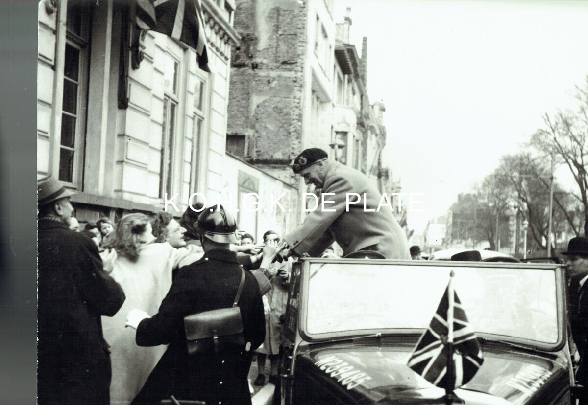 Vergroting. - Formaat : 28 x 40 cm. - Veldmaarschalk Montgomery wordt tijdens zijn eerste bezoek aan Oostende, aan de woning van burgemeester Henri Serruys in de Karel Janssenslaan, begroet door enkele enthousiaste vrouwen. Rechts het Leopoldpark.