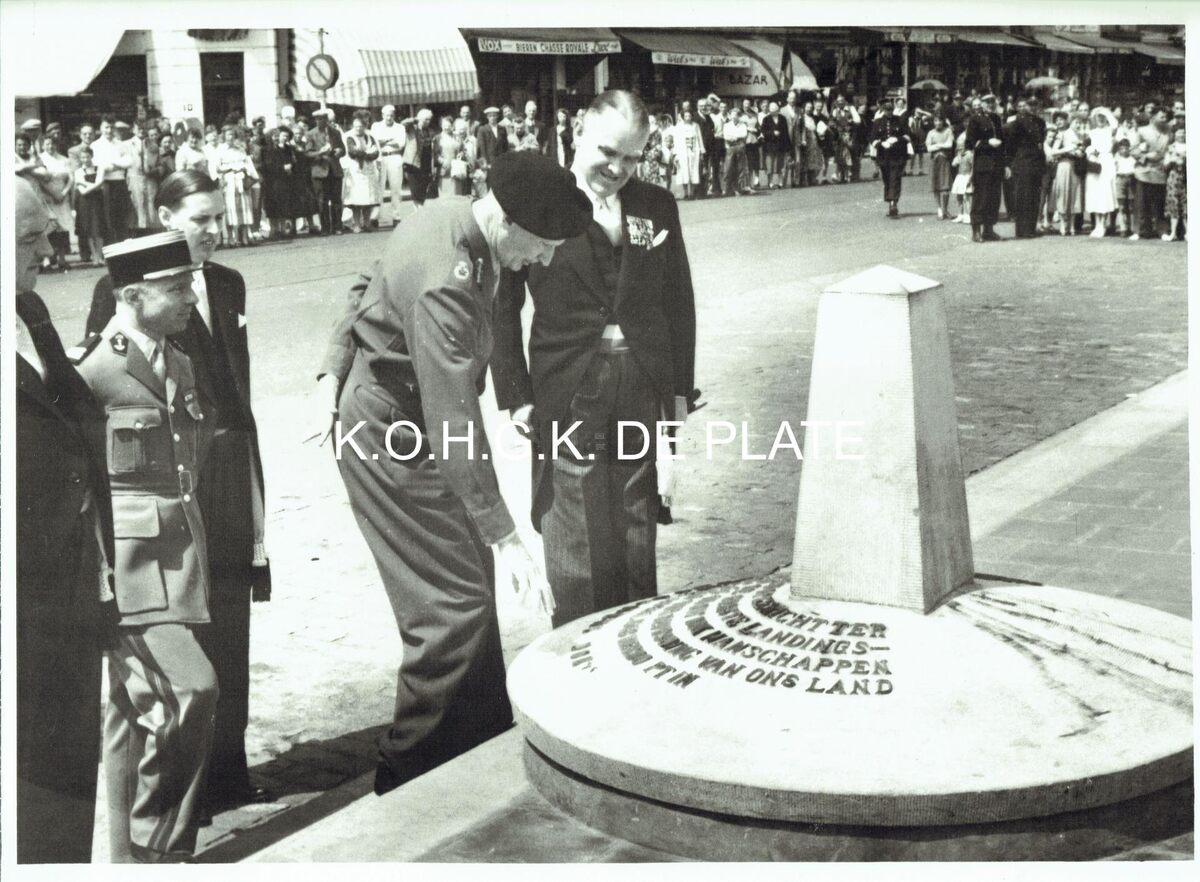Vergroting. - Formaat : 28 x 40 cm. - Veldmaarschalk Montgomery en burgemeester Adolf Van Glabbeke bij de gedenksteen dat bij zijn eerste bezoek aan de stad in 1948 werd geplaatst. Op de achtergrond hoek Visserskaai en Vissersplein. Op de foto herkennen we ook schepen Jan Piers.