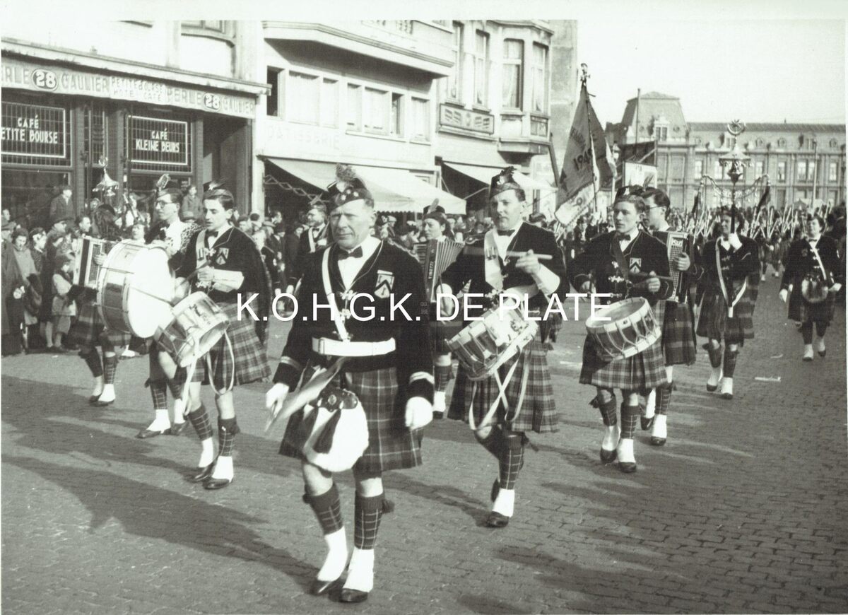 Vergroting. - Formaat : De "Ostendia Schotten" op het Sint-Petrus- en -Paulusplein. Links café "De Kleine Beurs"