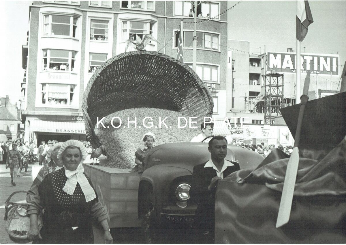 Vergroting. - Formaat : 30 x 40 cm. - Een praalwagen met een "benne" (=mand) gevuld met garnalen in een stoet op het Wapenplein. Op de achtergrond links de Brabantstraat.