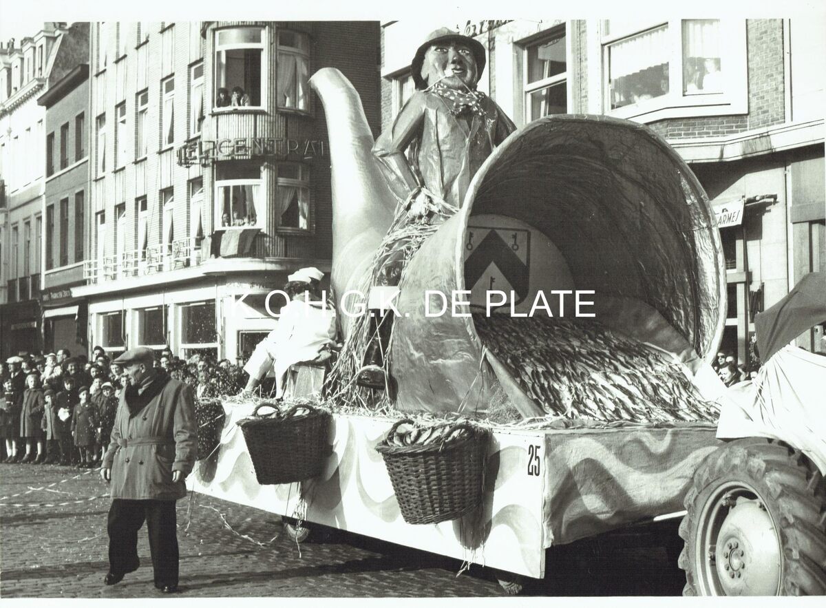 Vergroting. - Formaat : 30 x 40 cm. - Een praalwagen met vissers en hoorn des overvloeds met gerookte haring op het Wapenplein tegen de hoek Louisa- en Brabantstraat.