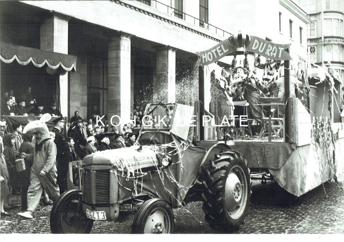 Vergroting. - Formaat : 30 x 40 cm. - Rattestoet, een groep met als thema "Rat Mort" defileert voorbij het feestpaleis op het Wapenplein. Links op de eerste rij burgemeester Jan Piers en schepen John Lauwereins.