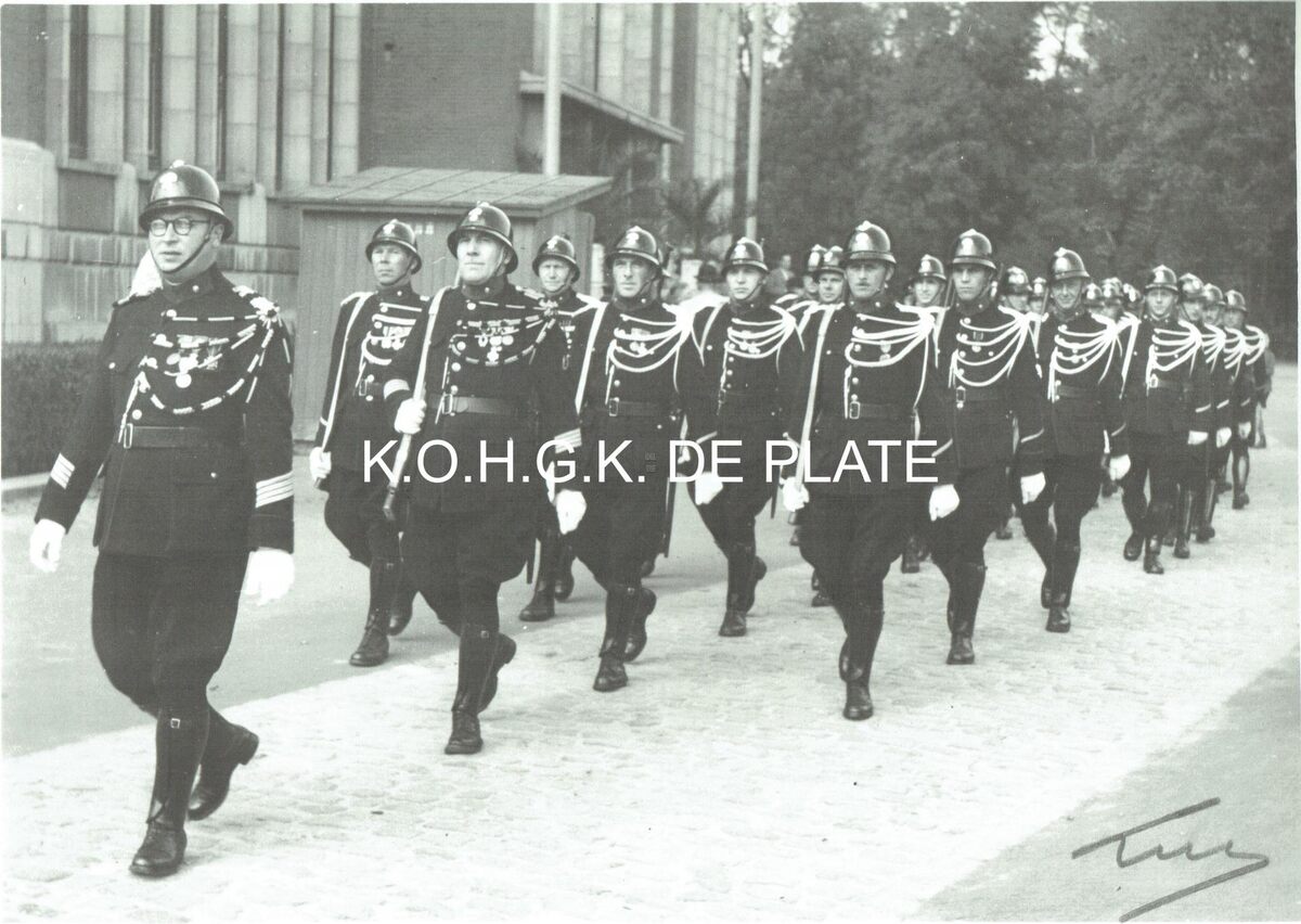 Vergroting. - Formaat : 30 x 40 cm. - Défilé van de Rijkswacht voor het Stadhuis (huidige Gerechtshof) aan het Canadaplein.