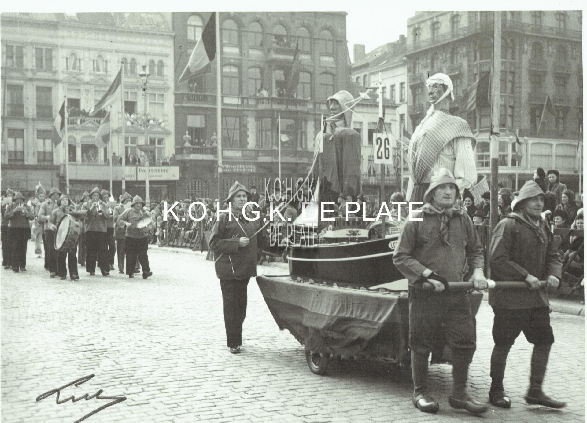 Vergroting. - Formaat : 30x 40 cm. - Halfvastenstoet op het Wapenplein. Een maquette van een vissersboot gevolgd door een fanfare. De Oostendse reuzen Tone en Wanne kijken toe.