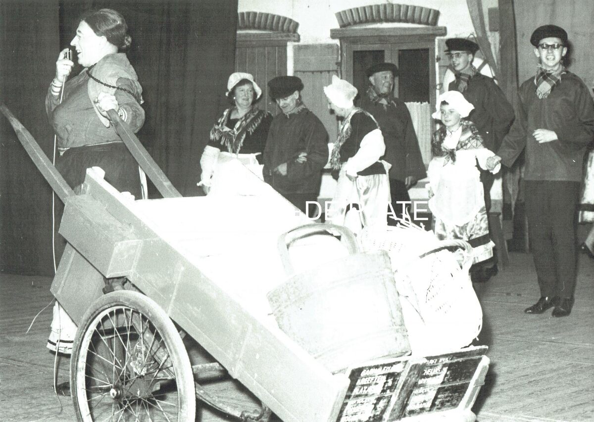 Vergroting. - Formaat : 30 x 40 cm. - Een optreden van Jeroom Depoorter (?) de Bredense komiek met de folkloregroep "Het Loze Vissertje"