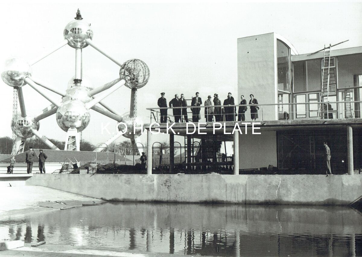 Vergroting. - Formaat : 30 x 40 cm. - Het Oostends paviljoen en het Atomium in opbouw