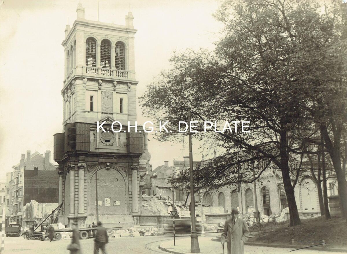 Formaat: 23 x 30 cm. - Het vernielde postgebouw in de Hendrik Serruyslaan. Links de Wittenonnenstraat