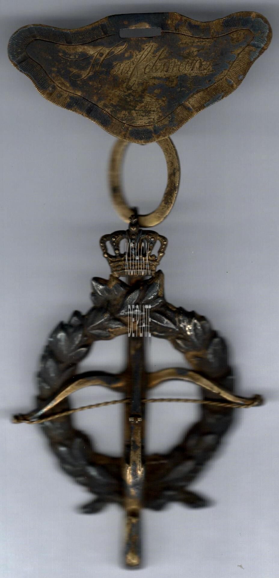 Onder het plaket hangt aan een oog een rechtopstaande kruisboog met bovenop een kroon, geplaatst op een lauwerkrans bestaande uit twee lauriertakken die onderaan samengestrikt zijn.