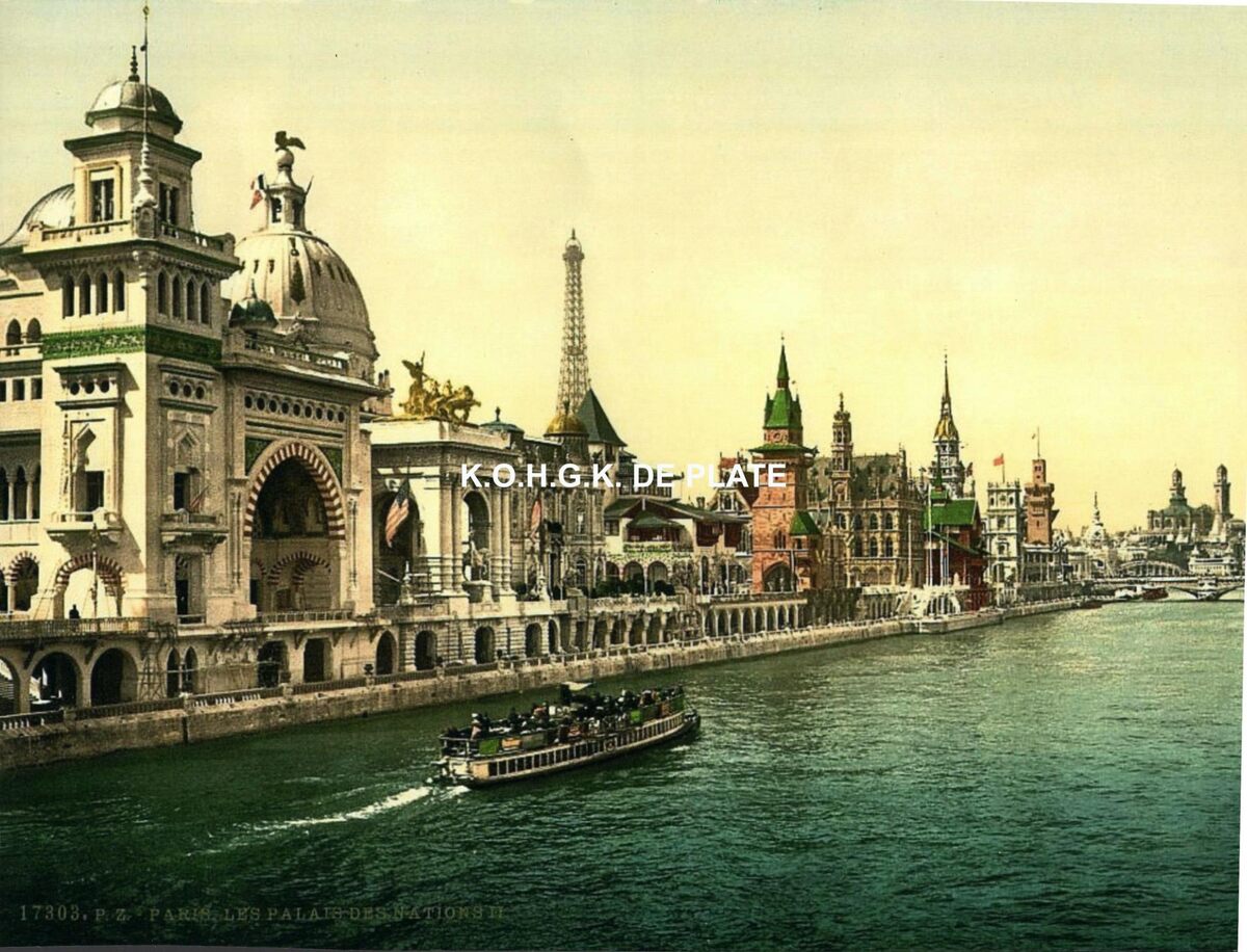Formaat : 19 x 25 cm. - De paviljoenen van de wereldtentoonstelling van Parijs in 1900 langs de Seine. Vermoedelijk maakte koning Leopold II tijdens zijn bezoek aan de Wereldtentoonstelling van Parijs in 1900 kennis met het Noorse paviljoen van architect Knudsen en liet hij de Noorse stallingen in de Koninginnelaan en de 3 gebouwen in het Domein Raversijde in dezelfde stijl ontwerpen.