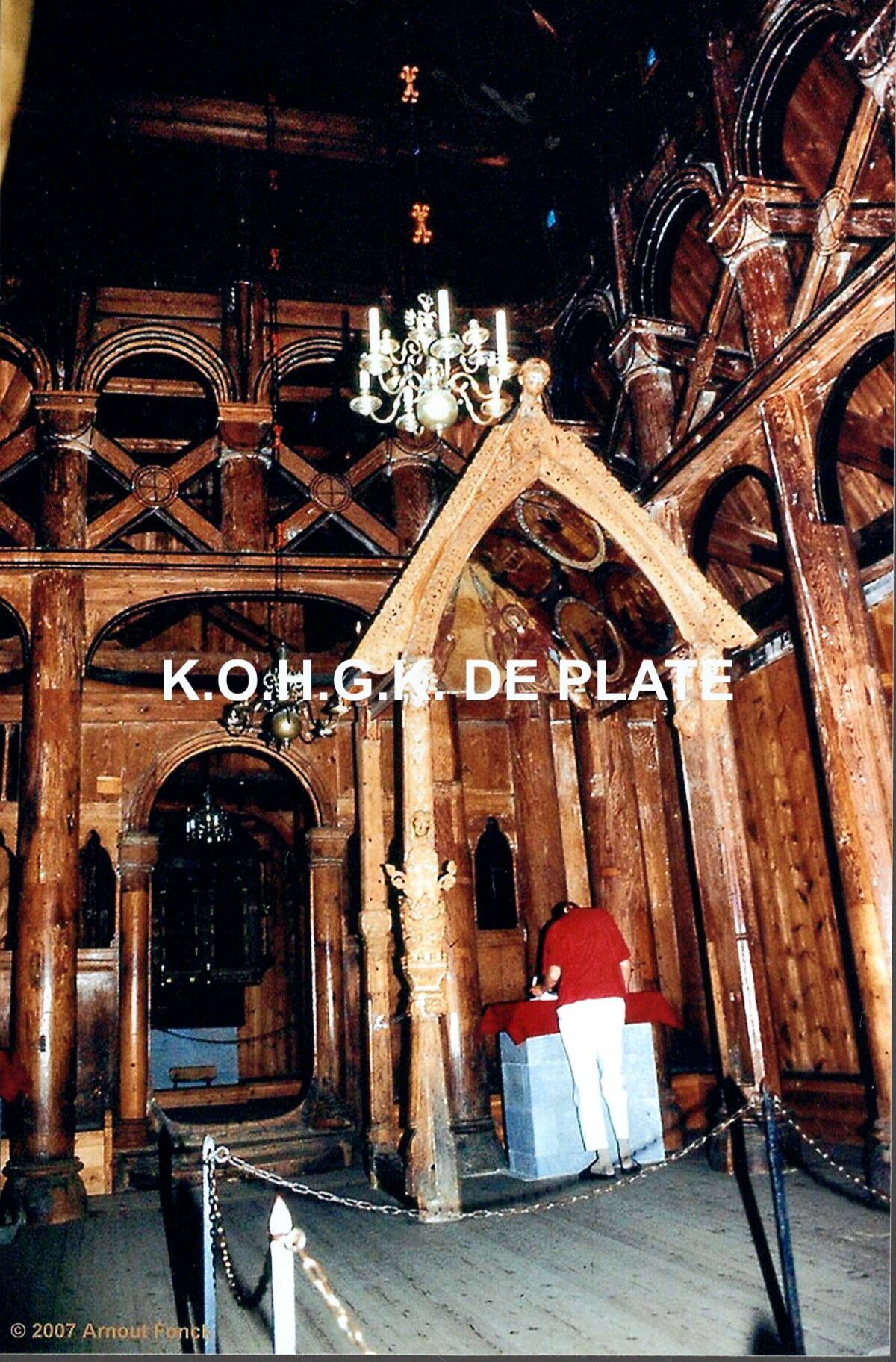 Formaat : 15 x 10 cm. - Het interieur van een Noorse staafkerk in Dragenstil