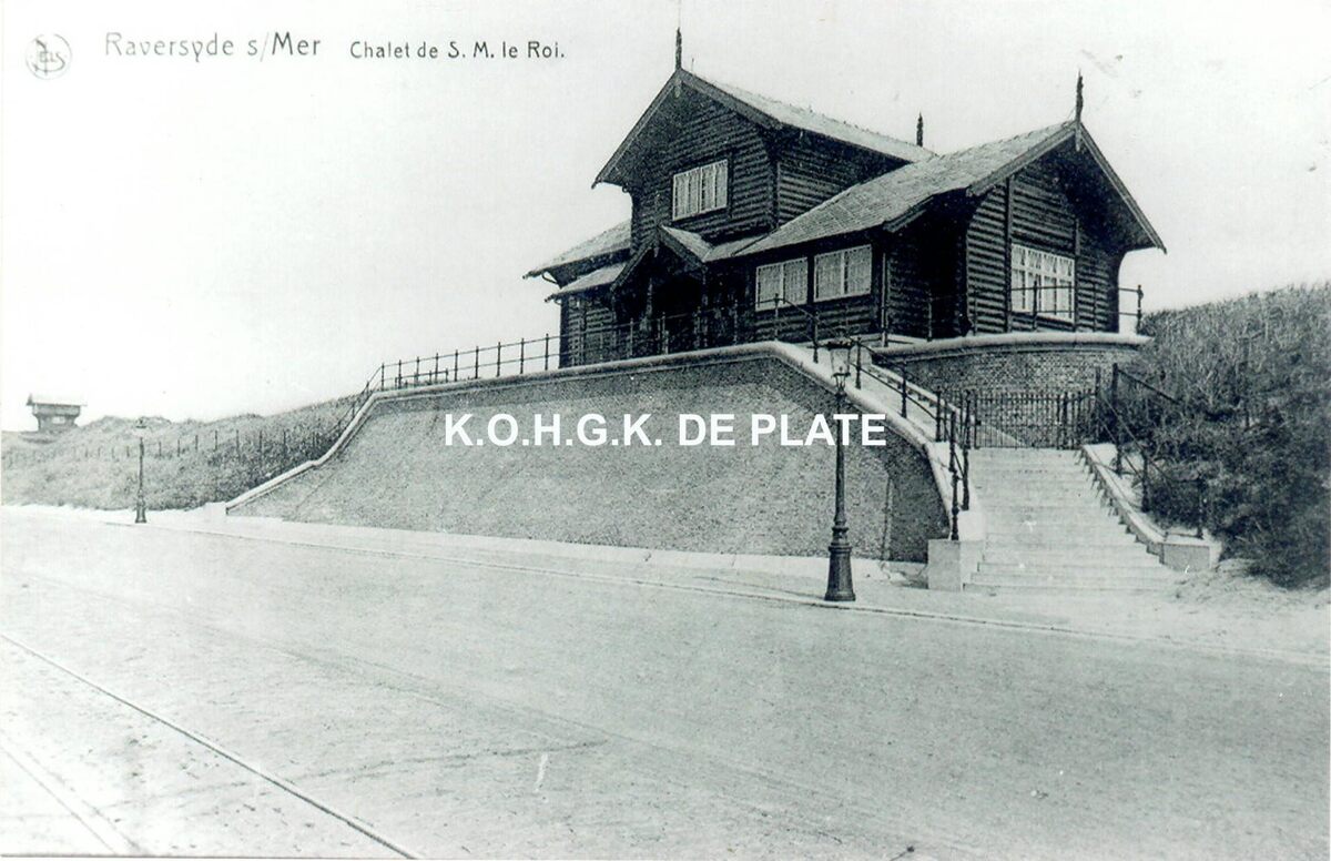Formaat : 13 x 18 cm. - Het Koninklijk Chalet en wat verder het tuinpaviljoentje gelegen langs de Zeedijk( Raversijde), gebouwd naar de plannen van de Noorse architect Knudsen. Vanaf 1897 reed er een tram tussen Oostende en Middelkerke op de geëffende duinen. Zie (20). Vanaf oktober 1906 tot pasen 1907 werd begonnen met het verplaatsen van het spoor tussen Mariakerke en Middelkerke naar de wandeldijk toe om het aanleggen van een rijweg mogelijk te maken. De foto toont de nieuwe situatie.