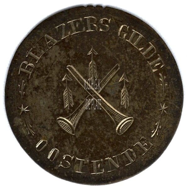 Op de voorzijde : rondom boven BLAZERS GILDE, rondom onder OOSTENDE, centraal twee gekruiste blaaspijpen en 3 pijlen