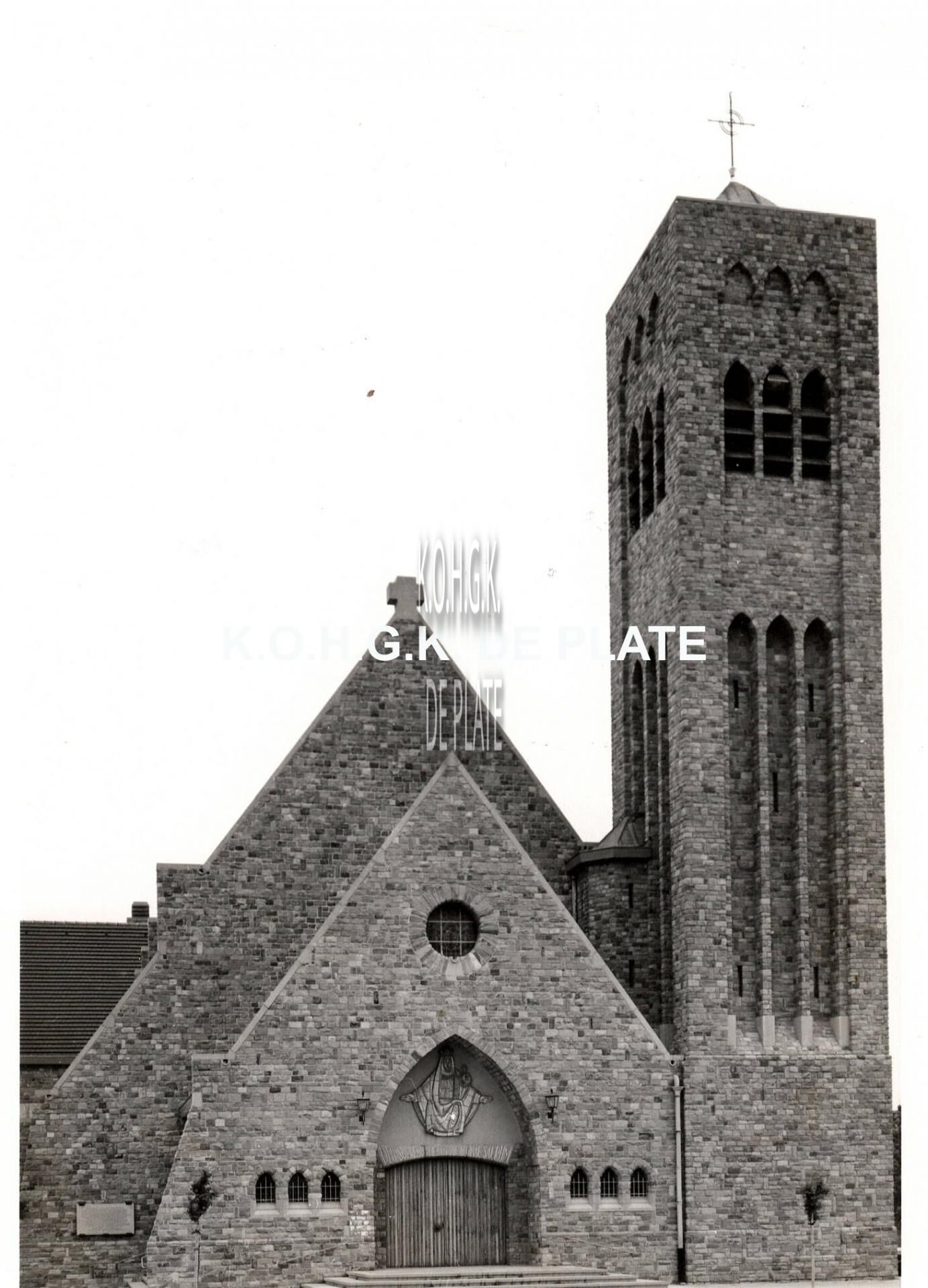 Formaat : 18 x 13 cm. - De kerk werd gebouw tussen 1956 en 1959 naar de plannen van architect Sylvain Smis onder het pastoraat van Georges Borre. Pseudo-gotische kerk onder één zadeldak, met uitspringend westportaal, een klein transept en uitgebouwd koor, met de toren op het zuidwesten.