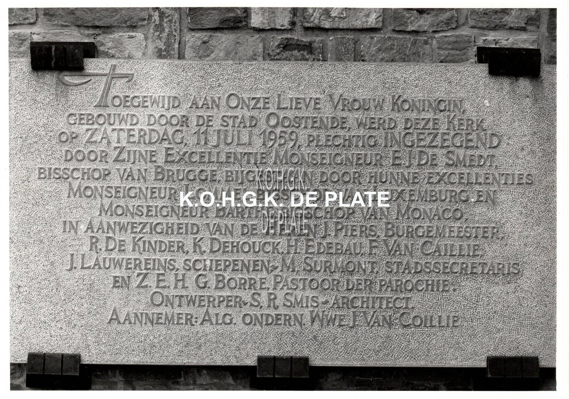 Eerste steen van de kerk, 1959, ingewerkt in triomfboog; arduinen stichtingssteen exterieur, 1959.