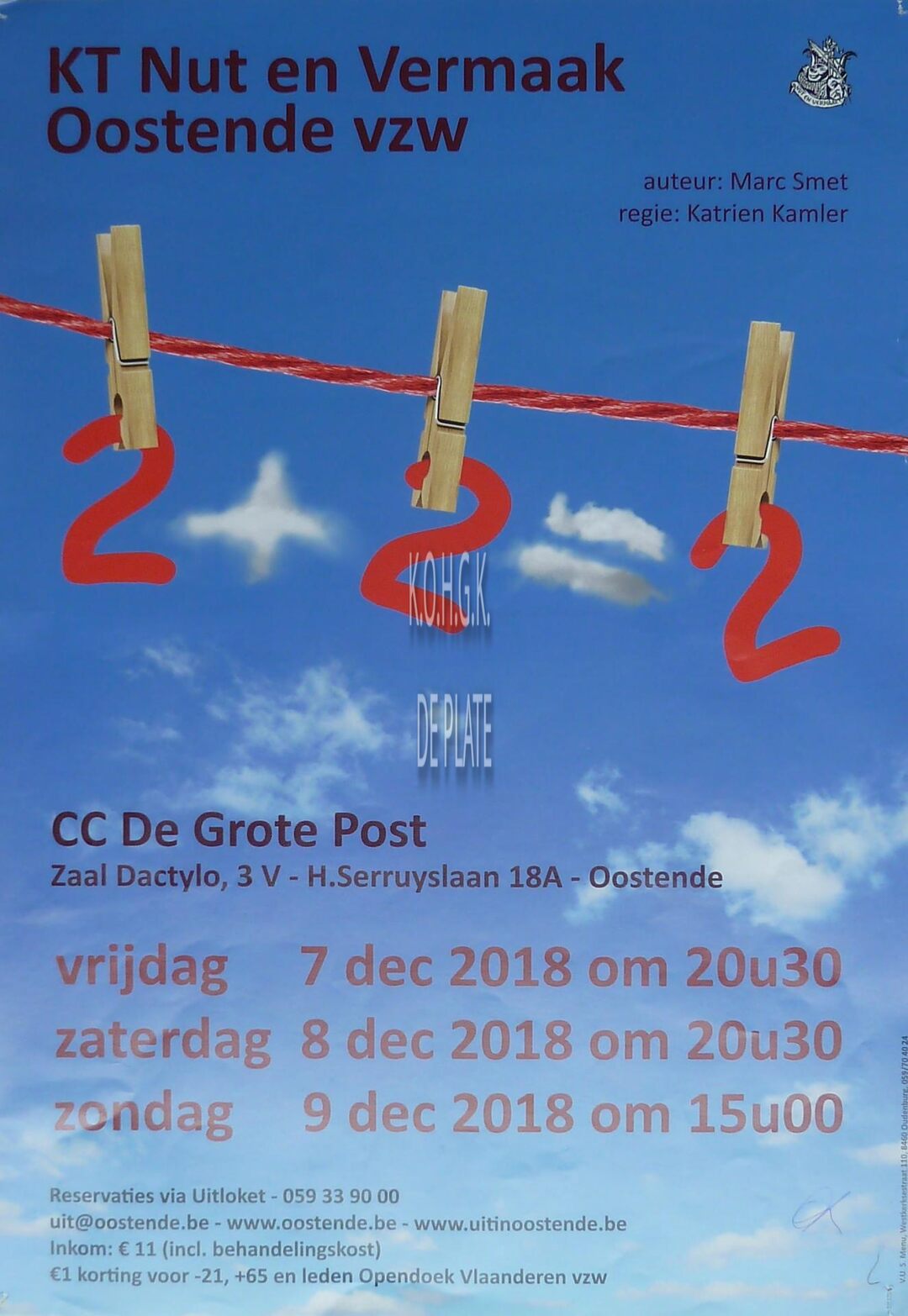 Affiche : Koninklijke toneelkring Nut en Vermaak. 2+2=2. Cultuurcentrum De Grote Post. 07-09/12/2018