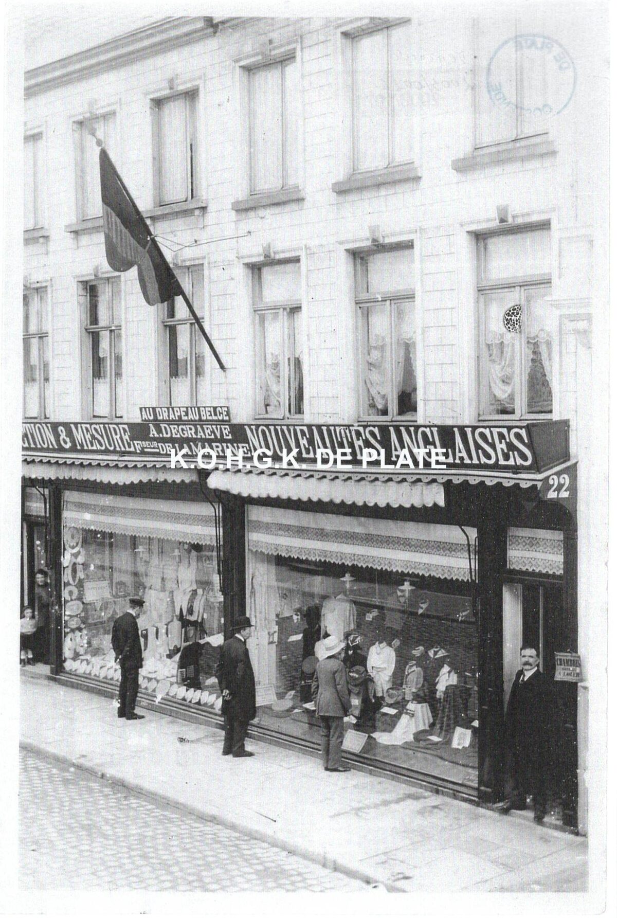 Afdruk. - Formaat : 21 x 14 cm. - Au Drapeau Belge - Confections & meseure - A. Degraeve - Nouveautés Anglaises - confisseur de la marine. Later kwam hier de elektriciteitszaak van Oscar Alleyn