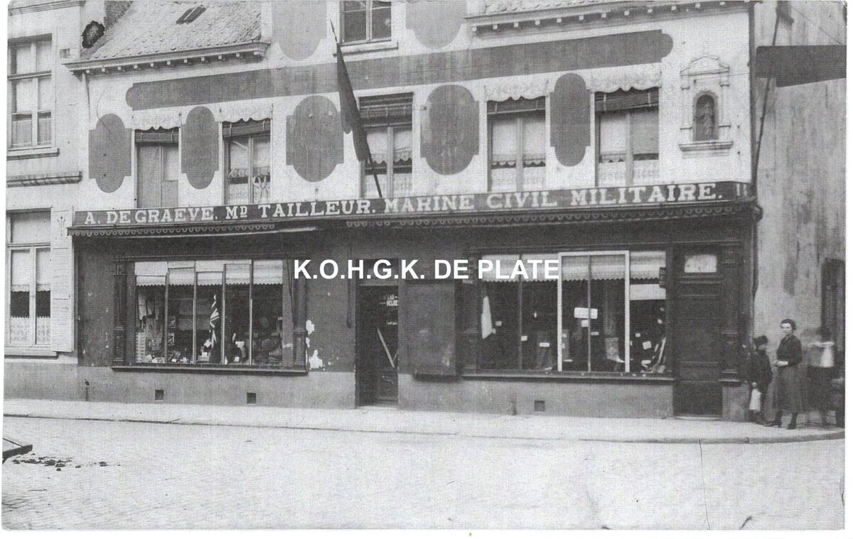 Afdruk. - Formaat : 13 x 20 cm. - Nieuw gebouw op de hoek van de Kaaistraat en de Ooststraat. A. Degraeve. md. Tailleur. Marine civil militaire. Helemaal rechts op de eerste verdieping een beeldje (waarschijnlijk Gerardus Majella, patroonheilige van de kleermakers), in een nis boven de private ingangsdeur