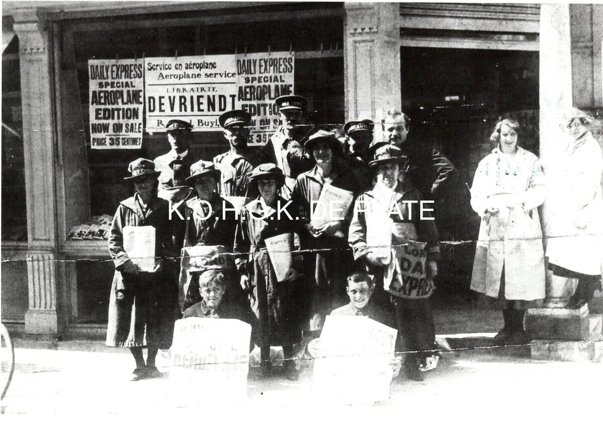 Formaat : 10 x 15 cm. - De heer en mevrouw Devriendt met hun personeel voor de boekhandel