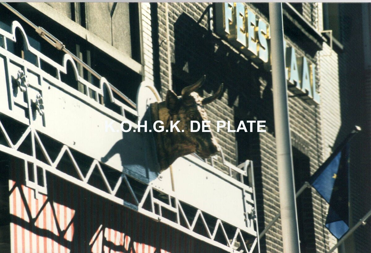 Formaat : 10 x 15 cm. - Keurslager Bossuyt, Torhoutsesteenweg 44. Hier kwam in 2013 appartementsgebouw ONYX II met op nummer 46 keurslager Derycker. Rundskop op de luifel