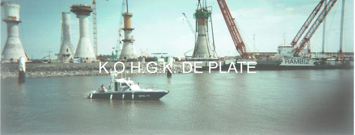 Formaat : 10 x 25 cm. - Bouwen van de zes kandelaars voor het windmolenpark op de Thortonbank in de Noordzee. In de achtergrond vuurtoren Lange nelle. Hefschip Rambiz aan het werk en patrouillevaartuig SPN-15 van de politie in de havengeul