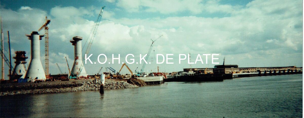 Formaat : 10 x 25 cm. - Bouwen van de zes kandelaars voor het windmolenpark op de Thortonbank in de Noordzee. Rechts in de achtergrond de vismijn.