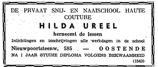 Advertentie : De privaat snij- en naaischool haute couture Hilda Ureel. Nieuwpoortsesteenweg 585, Oostende