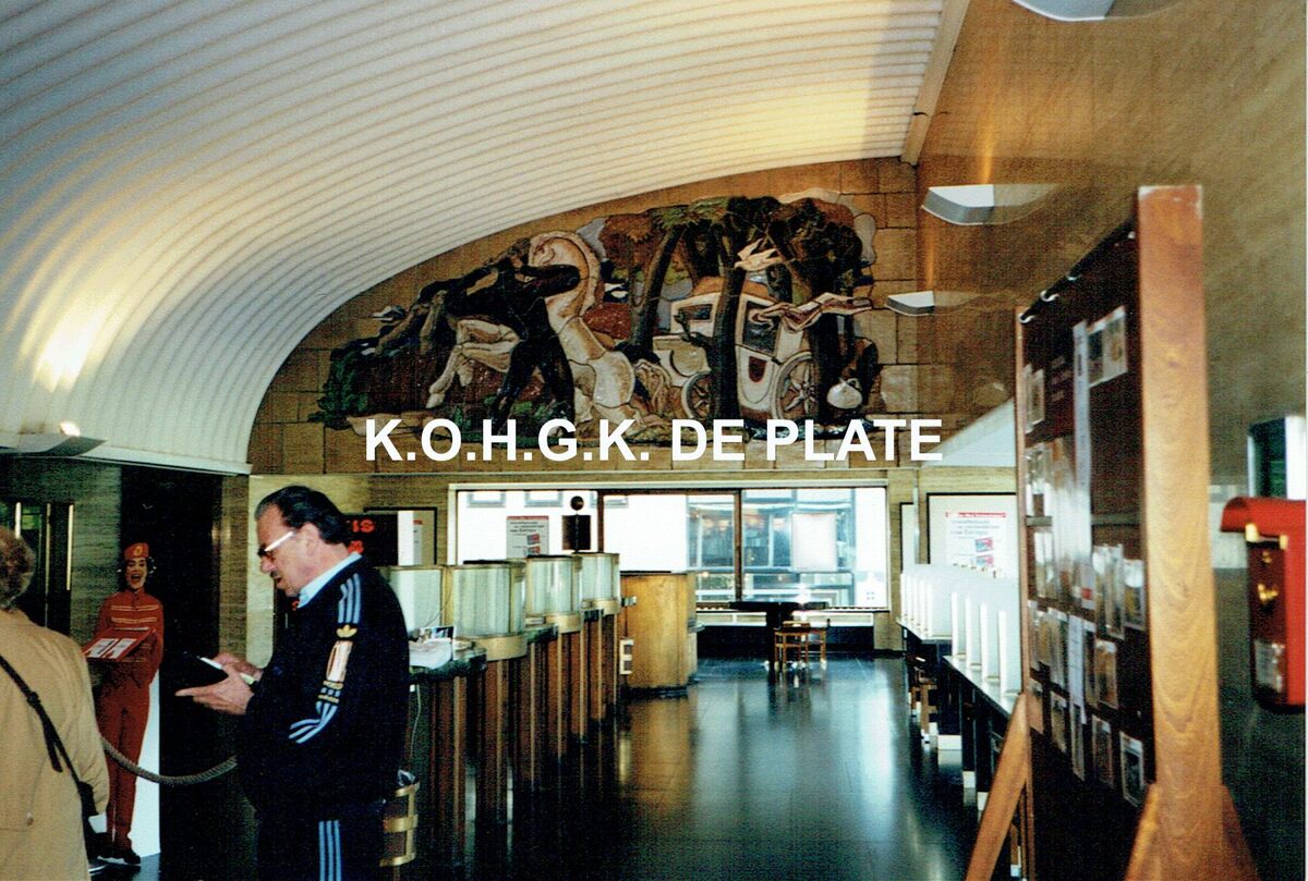Formaat : 10 x 15 cm. - De lokettenzaal van de vroegere grote post met de mooie wandkeramiek van Jo Maes. Het stelt de vroegere postbedeling voor.