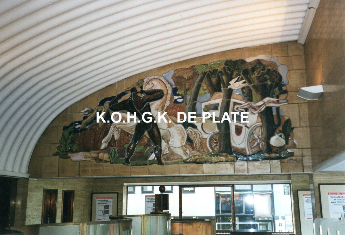 Formaat : 10 x 15 cm. - De lokettenzaal van de vroegere grote post met de mooie wandkeramiek van Jo Maes. Het stelt de vroegere postbedeling voor.