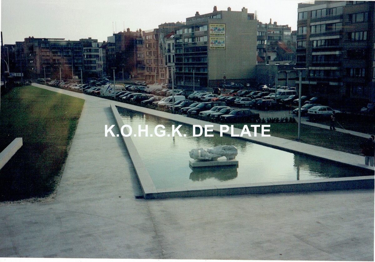 Formaat : 10 x 15 cm. - De vijver voor de bibliotheek met het beeld Santa Devota (beschermvrouw van de zeelieden) vervaardigd door Stefaan en Livia Depuydt-Canestraro