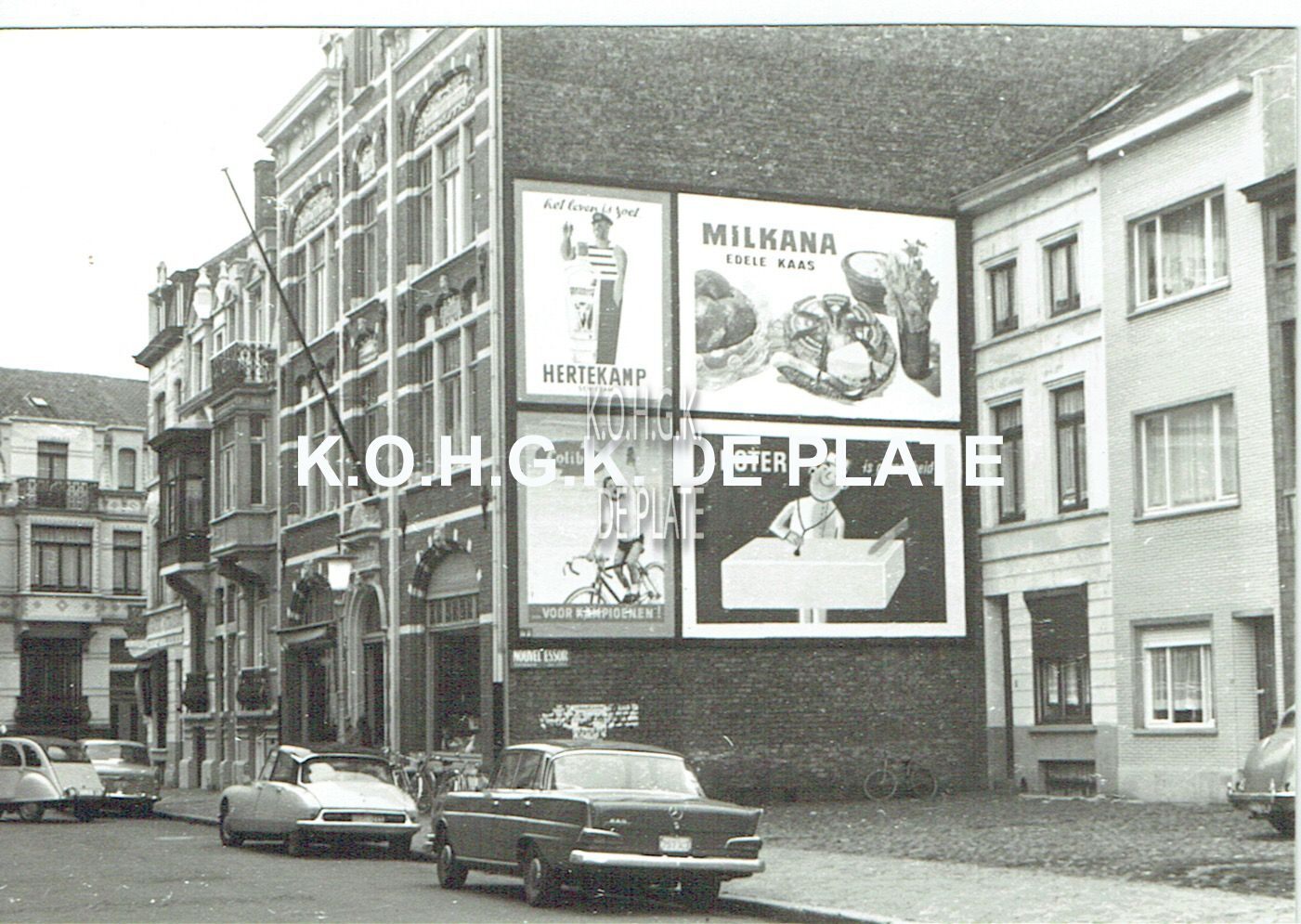 Formaat : 10 x 15 cm. - Op de muur reclamepanelen voor Hertekamp jenever, Milkana smeerkaas, Colibri drankje en boter