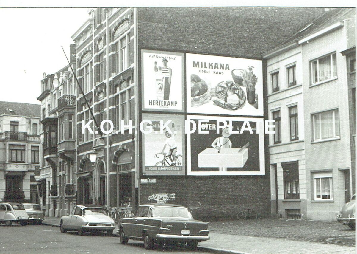 Formaat : 10 x 15 cm. - Op de muur reclamepanelen voor Hertekamp jenever, Milkana smeerkaas, Colibri drankje en boter