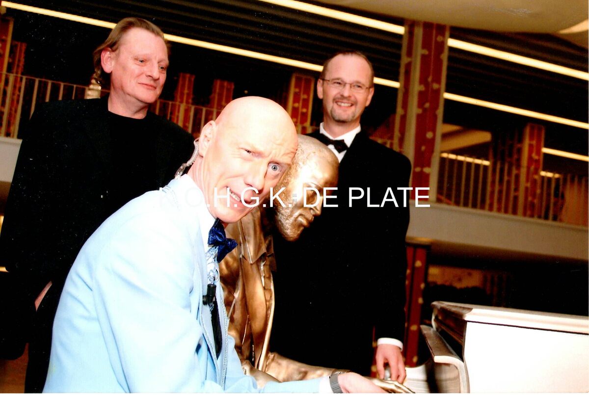 Formaat : 10 x 15 cm. Schepen Bronders, Herr Seele en ? bij het beeldhouwwerk "Marvin Gaye"